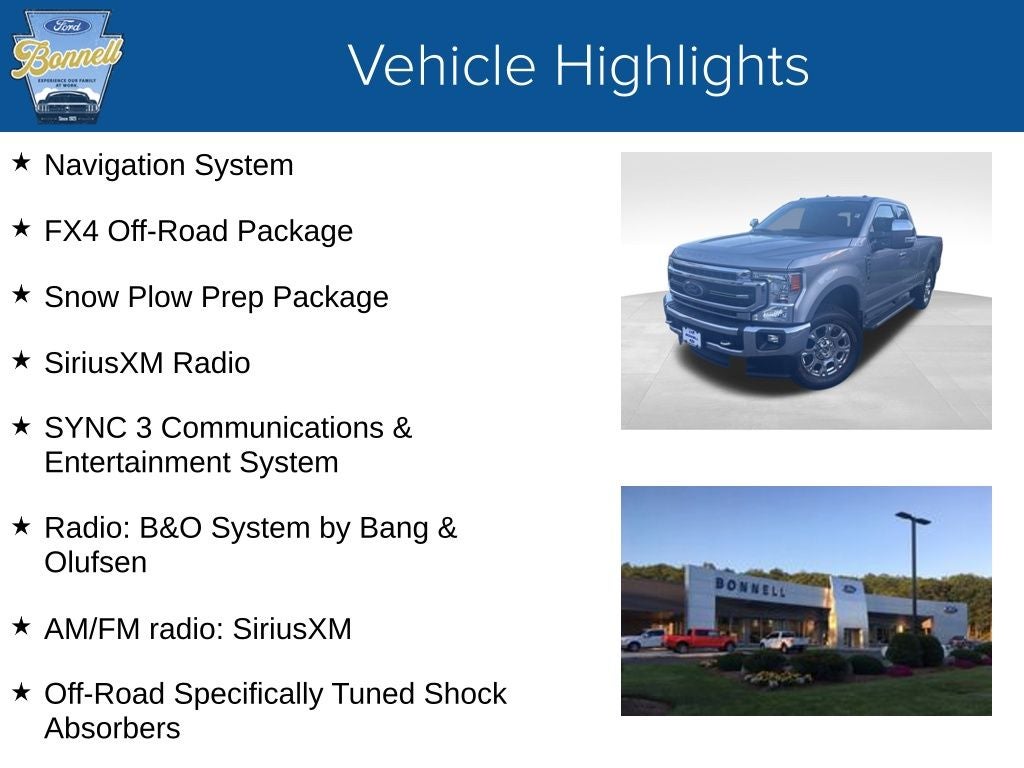 Iconic Silver Metallic 2020 Ford F-250SD Lariat 4WD 10-Speed Automatic 7.3L V8 PFI SOHC 16V Federal 385hp 4WD, 110V/400W Outlet, AM/FM radio: SiriusXM, FX4 Off-Road Package, Heated Steering Wheel, Hill Descent Control, Navigation System, Off-Road Specifically Tuned Shock Absorbers, Power Heated/Ventilated Driver Seat w/Memory, Radio: B&O System by Bang & Olufsen, SiriusXM Radio, Snow Plow Prep Package, SYNC 3 Communications & Entertainment System, Unique FX4 Off-Road Box Decal, Wheels: 20 Chrome PVD Aluminum.